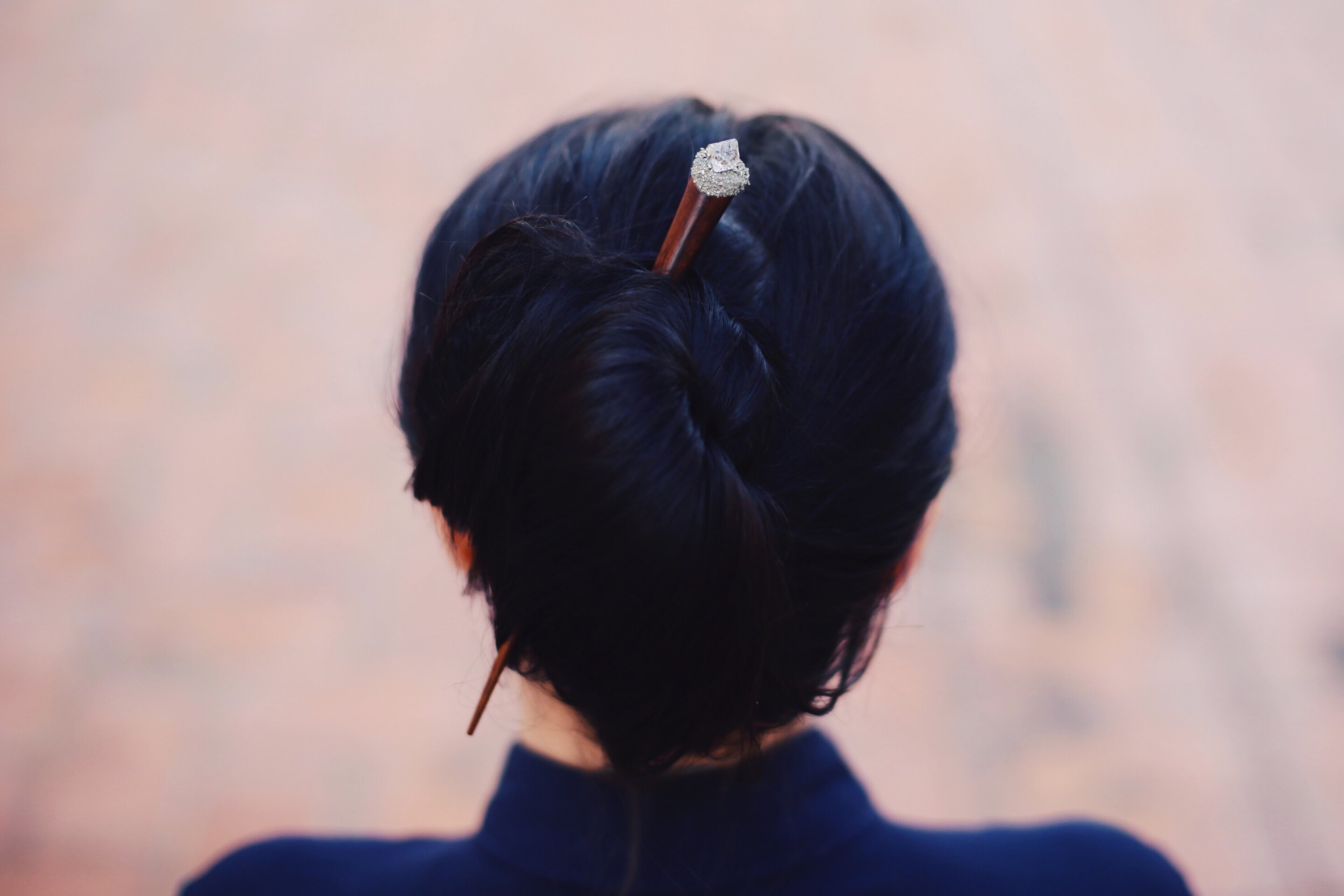palos de madera para cabello con calcopirita incrutada en tonos azules o verdes, con pirita triturada incrustada